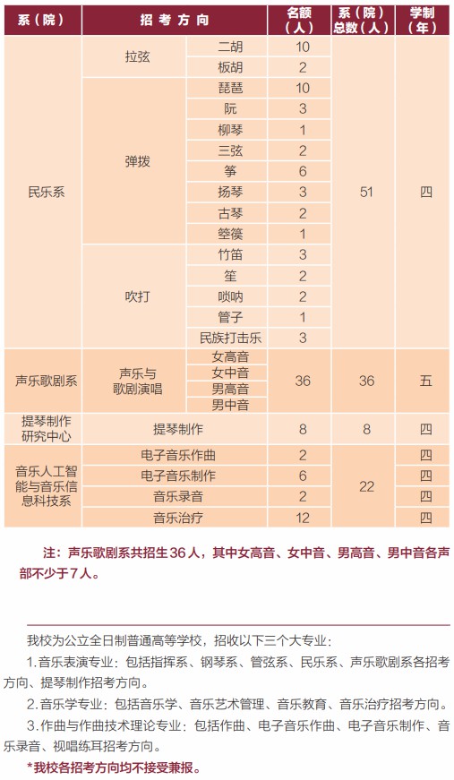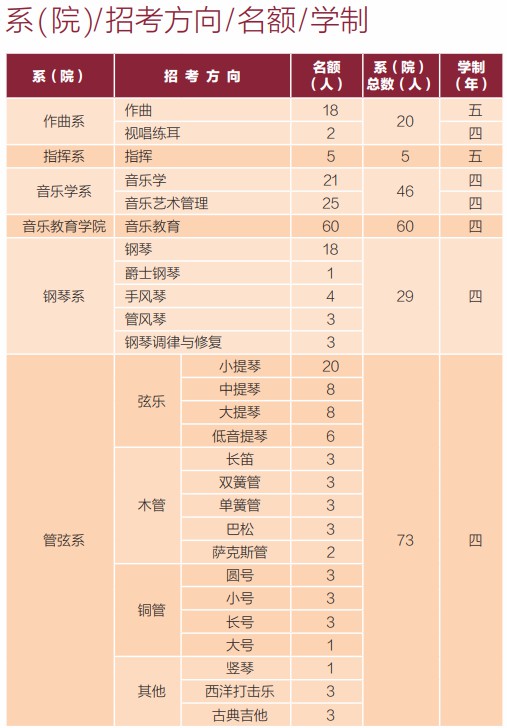 1. 音乐表演专业,包括指挥系、管弦系、民乐系、钢琴系,声乐歌剧系各专业方向,以及提琴制作专业。声乐歌剧专业只招收美声唱法,没有民族和流行唱法。