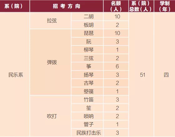 民乐系:2020年招生49人,2021年招生51人,增加2人。其中板胡2020年招生1人,2021年招生2人,增加1人;箜篌2020年未招生,2021年招生1人。