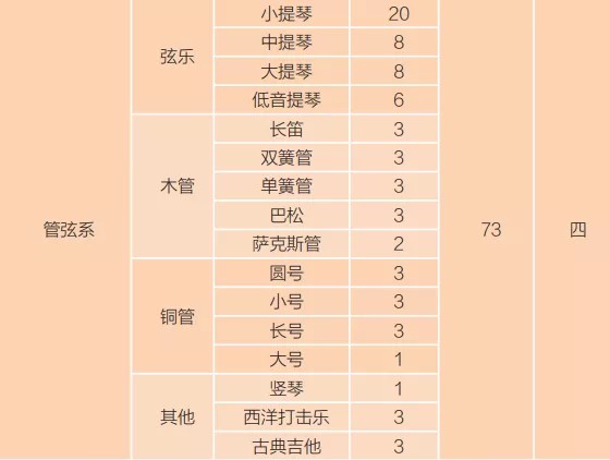 低音提琴、长笛、双簧管、单簧管、巴松、萨克斯管、圆号、小号、长号、大号、竖琴、西洋打击乐、古典吉他:报考人数172人,招生37人,报录比≈4.65:1
