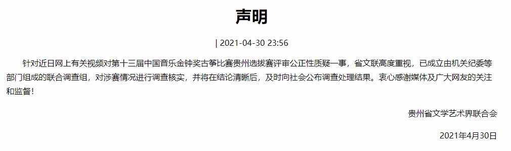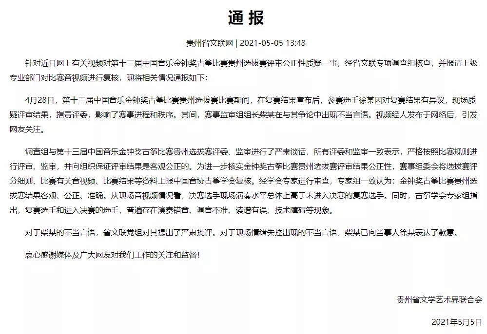 在5月5日,贵州省文联网发布了有关此事的通报。通报称,调查组已经与比赛的、监审进行了谈话,并将有关资料上报给了中国音协古筝学会进行了复核。经过讨论后,教授组一致认为,金钟奖古筝比赛贵州选拔赛结果客观、公正、准确。从现场音视频情况看,决赛选手现场演奏水平总体上高于未进入决赛的复赛选手。同时,古筝学会教授组指出,复赛选手和进入决赛的选手,普遍存在演奏错音、调音不准、读谱有误、技术障碍等现象。
