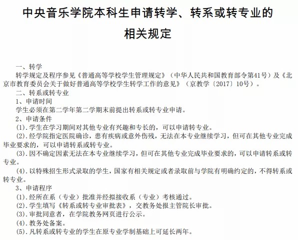 中央音乐学院本科管理制度规定,转系或转专业申请条件如下: