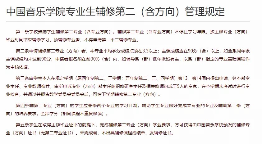 此外,中国音乐学院学生还可以申请辅修第二专业(方向),条件如下:本专业平均学分成绩点须在3.3以上;主课成绩应在90分(含)以上,如全系同年级主课成绩均未达到90分,申请者报名须在前30(含)内,如辅导系(部)低年级没有主,以系(部)指定的专业基础课程作为审核依据。