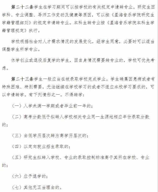 学生在学习期间可以按学校的有关规定申请转专业。研究生因学科、专业调整、导师工作变动及健康等原因,可以按《星海音乐学院研究生学籍管理细则》的规定申请转专业。本科生转专业按《星海音乐学院本科生学籍管理规定》执行。