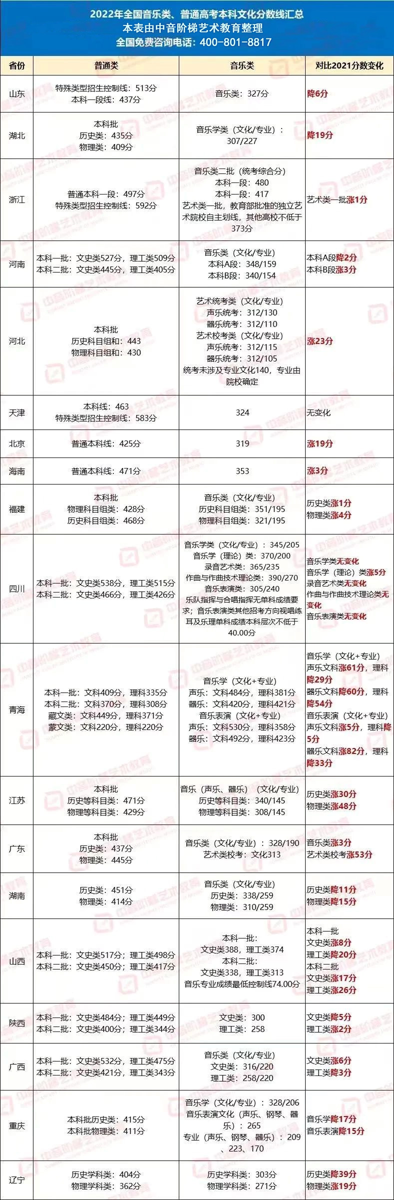 总体来看,各个省份音乐类控制文化线都300分上下,但值得注意的是,本科一批和本科二批的分数线都在400分以上。