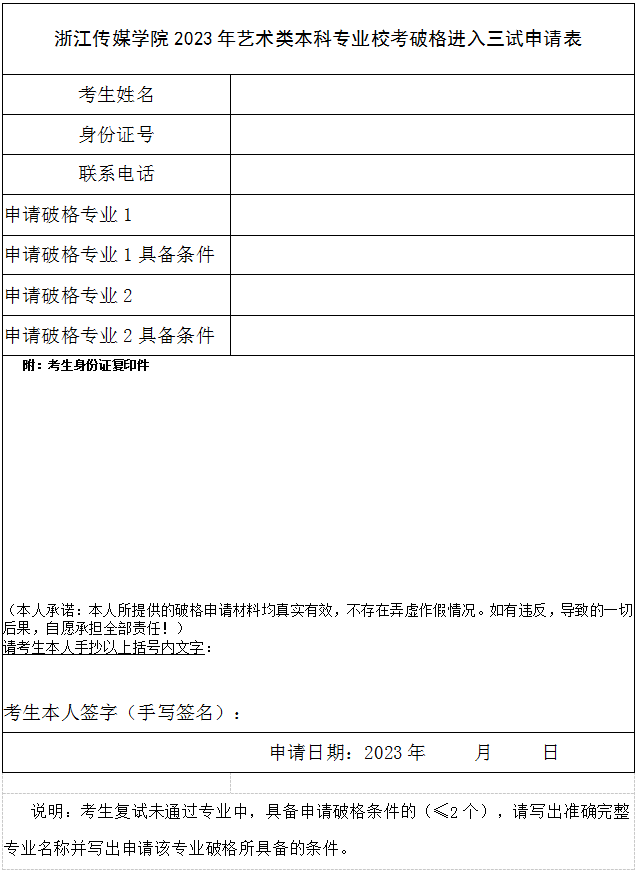 附件:浙江传媒学院2023年艺术类本科专业校考破格进入三试申请表