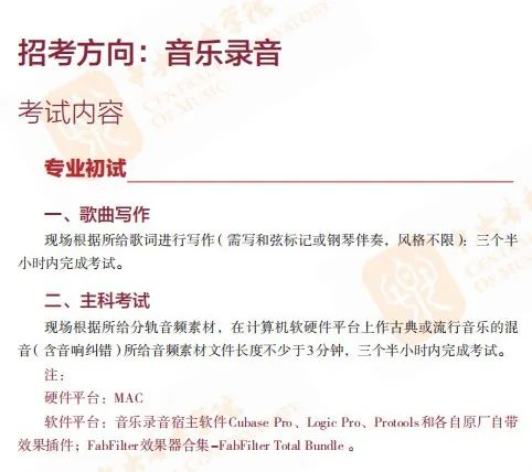 考试内容:即兴创作、和声分析、旋律写作、专业素养常识、歌曲写作、计算机软硬件平台作混音、钢琴或其他器乐能力、乐理、视唱练耳等。