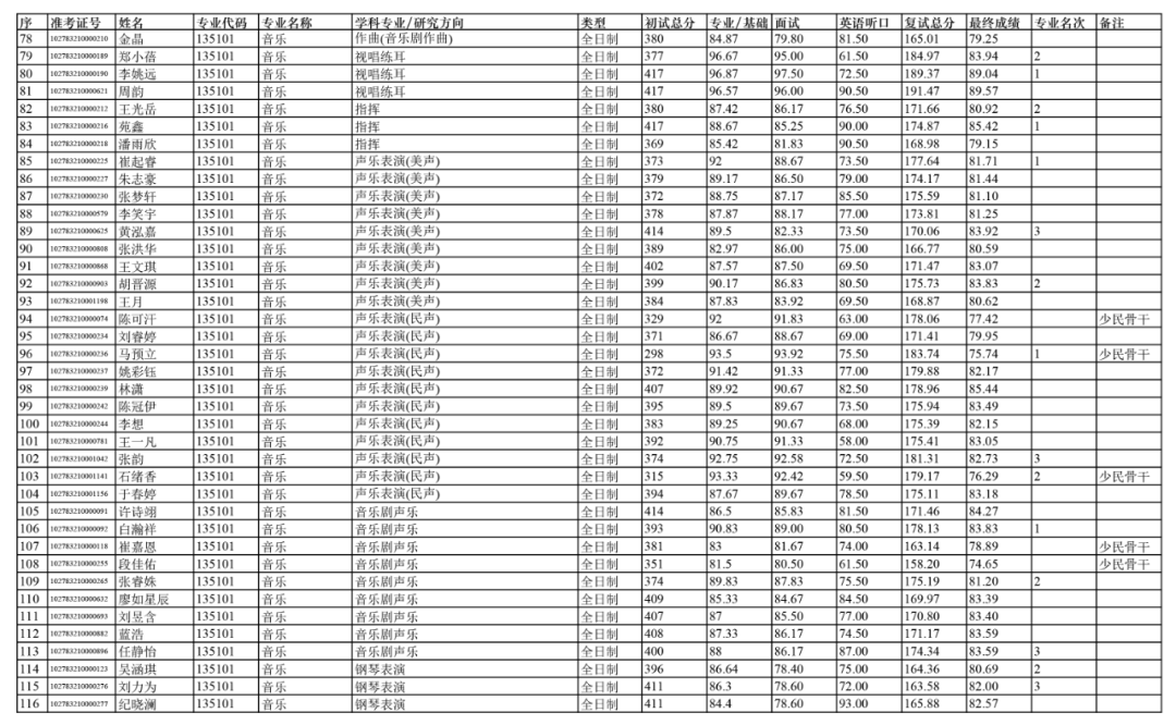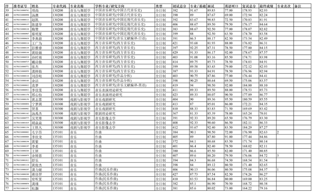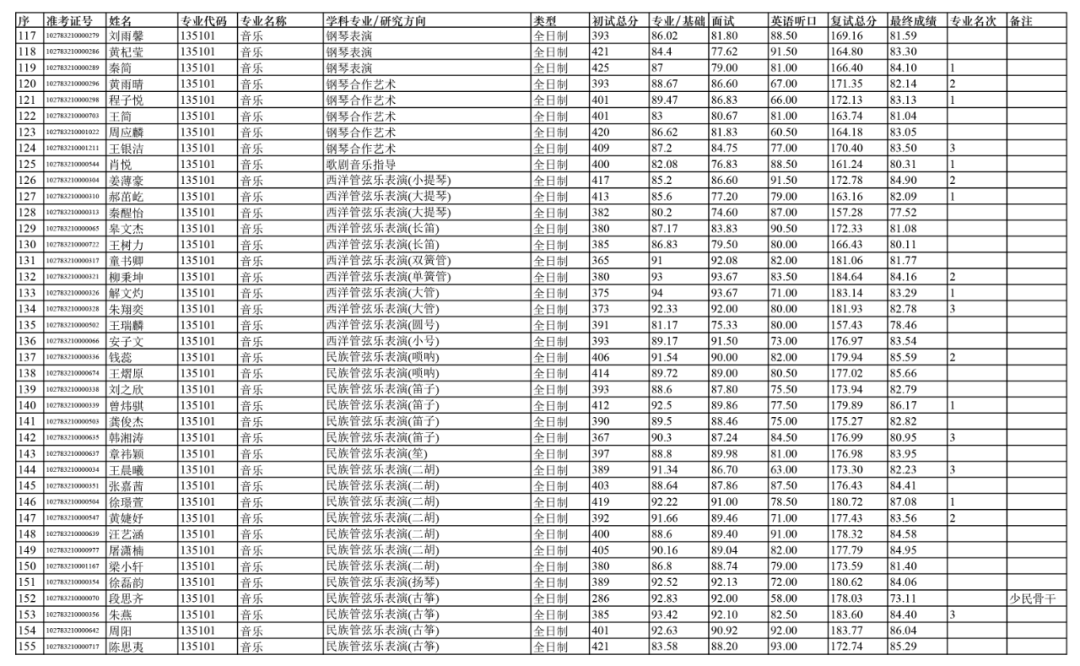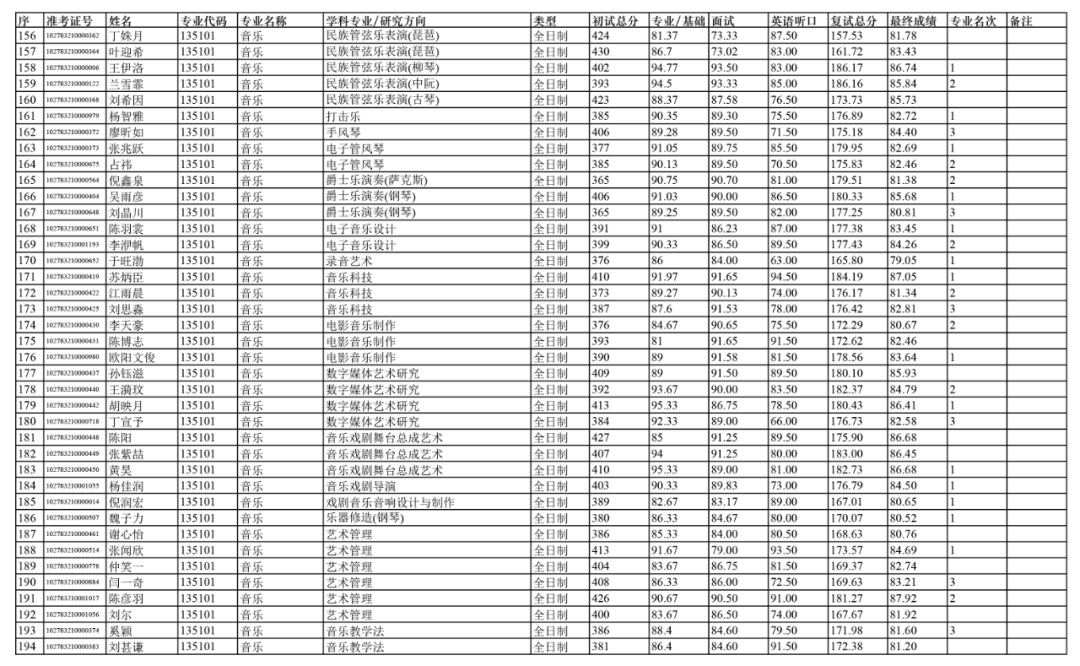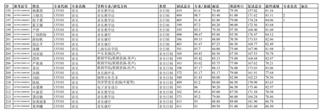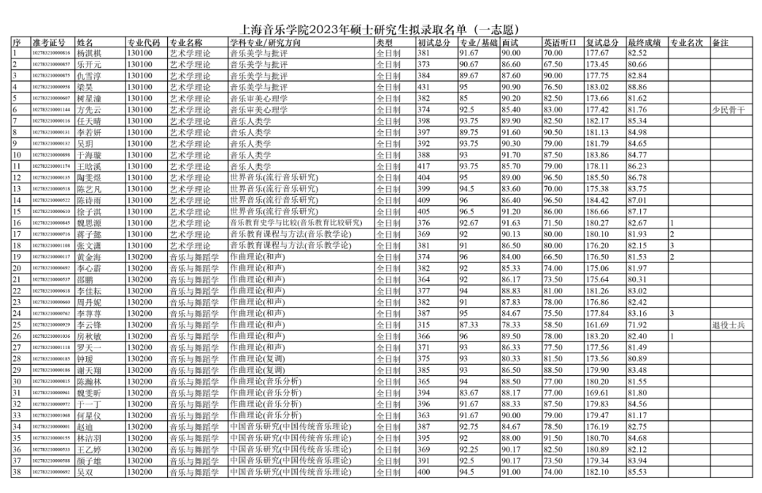 依据《上海音乐学院2023年硕士研究生招生复试及录取工作办法》,经上音硕士研究生招生工作领导小组2023年4月13日会议审定,拟录取以下人员为上海音乐学院2023级硕士研究生(不含推免生、港澳台研究生、留学生研究生)。