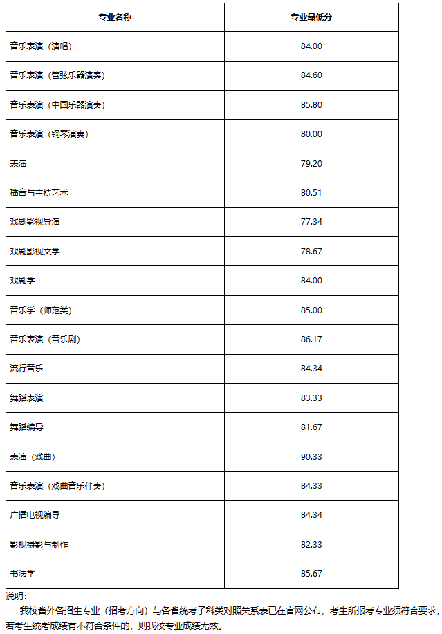 根据教育部有关规定,考生应符合我校公布的艺术类专业统考合格要求。如经考生所在省招生部门复核,考生统考成绩有不符合条件的,则我校专业成绩无效。