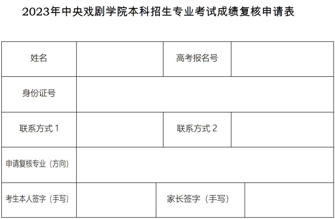 三、公示期间可提交成绩复核申请,考生需将《2023年中央戏剧学院本科招生专业考试成绩复核申请表》(附件2)及考生本人身份证正反面扫描件(以JPG格式作为邮件附件)发送至zhaosheng@zhongxi.cn,中央戏剧学院将于4月28日前以邮件形式回复。复核范围仅限登分、合分错误,对评分标准的异议不予受理。