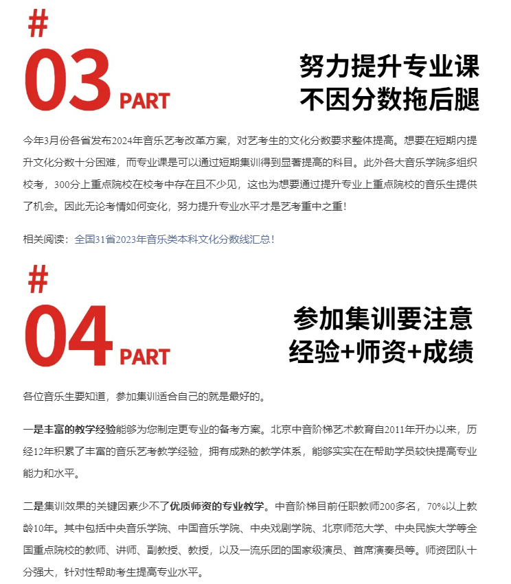 参加音乐艺考的考生一般分两种:一种是考生文化成绩距离理想大学有差距,需要通过艺考,提高优质院校录取机会;另一种是孩子从小学习音乐,有着浓厚的音乐兴趣,想要通过艺考努力实现自己的音乐梦想。