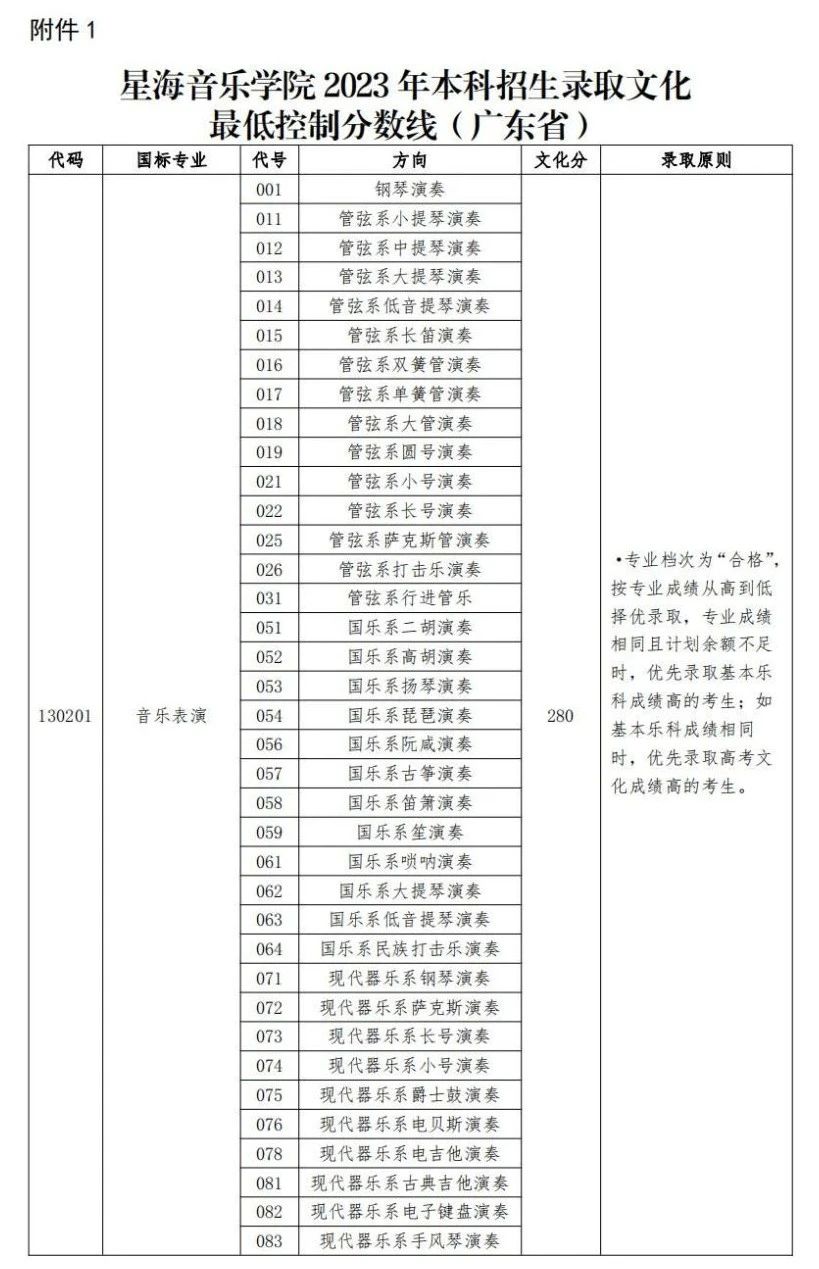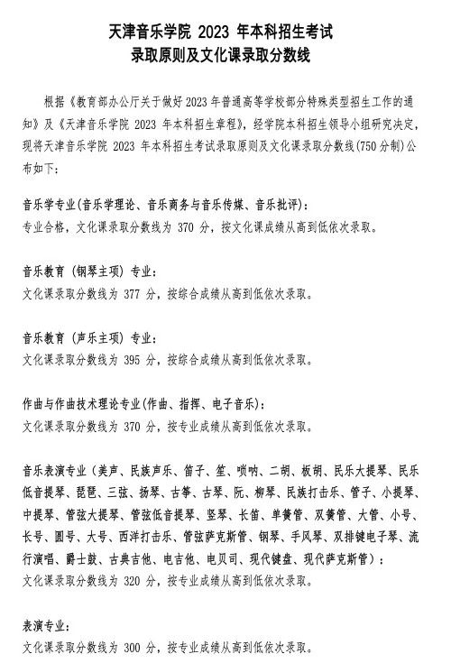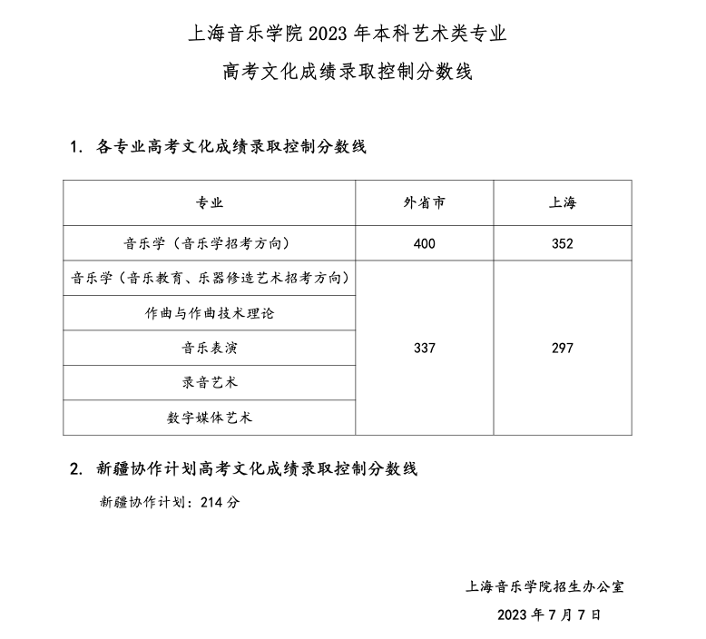 上海音乐学院2023年本科艺术专业,高考文化成绩录取控制分数线