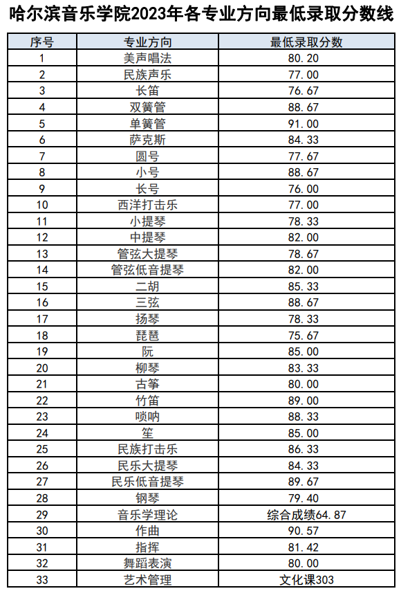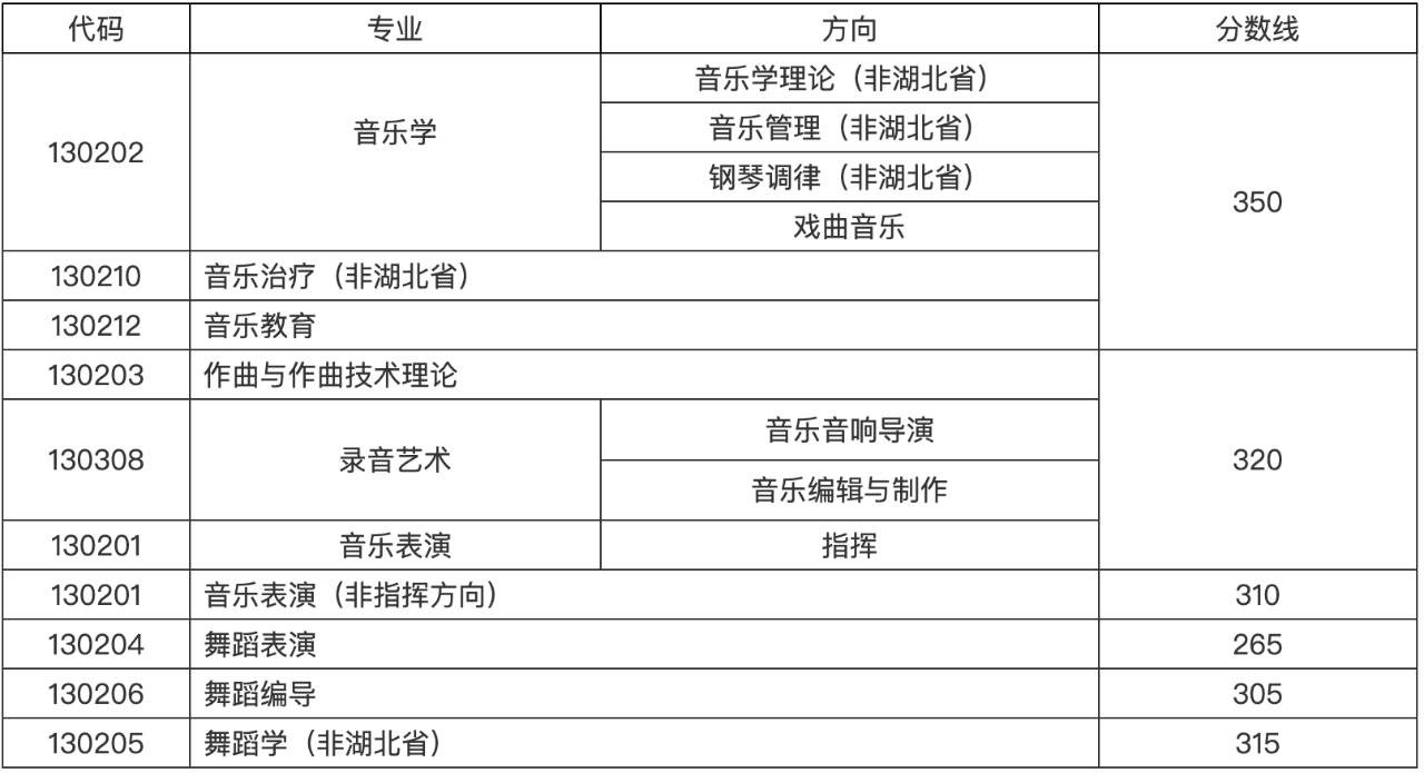 湖北省音乐学专业(音乐学理论、音乐管理、钢琴调律)方向、音乐治疗专业、舞蹈学专业按照《省招委关于湖北省2023年普通高校招生录取控制分数线的通知》中艺术类本科分数西安执行。