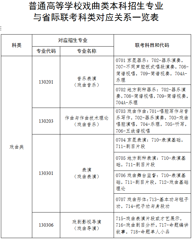 各专业(剧种)的科目和分值、内容和形式、考试要求、考查范围等具体信息详见戏曲类本科招生专业与省际联考科类对应关系表和戏曲类本科专业考试说明(见附件)。各专业(剧种)考试指南详见各组考高校招生公告。