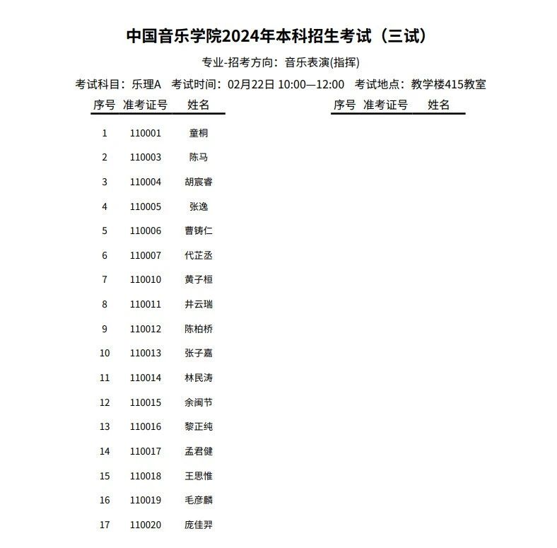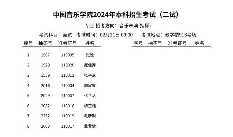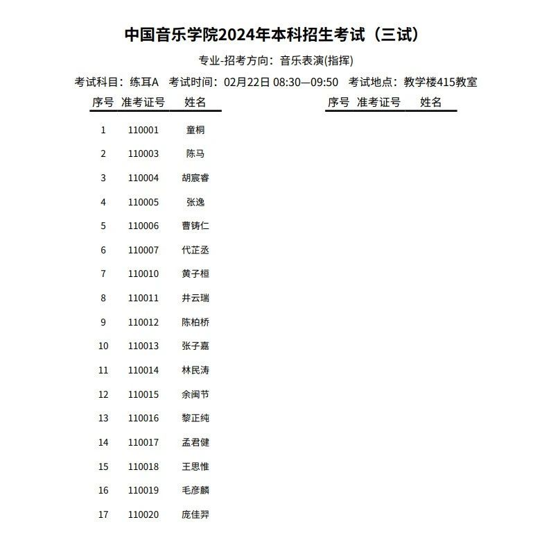 中国音乐学院2024年指挥招考方向二、三试考试安排及考生名单
