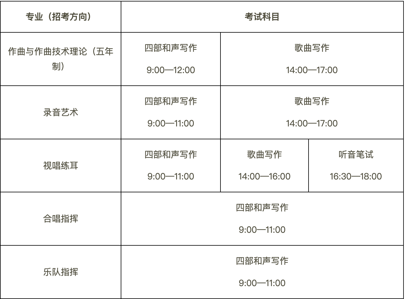 专业考试及视唱考试时间:上午8:30—11:30;下午13:00—17:00,具体考试时间详见准考证。