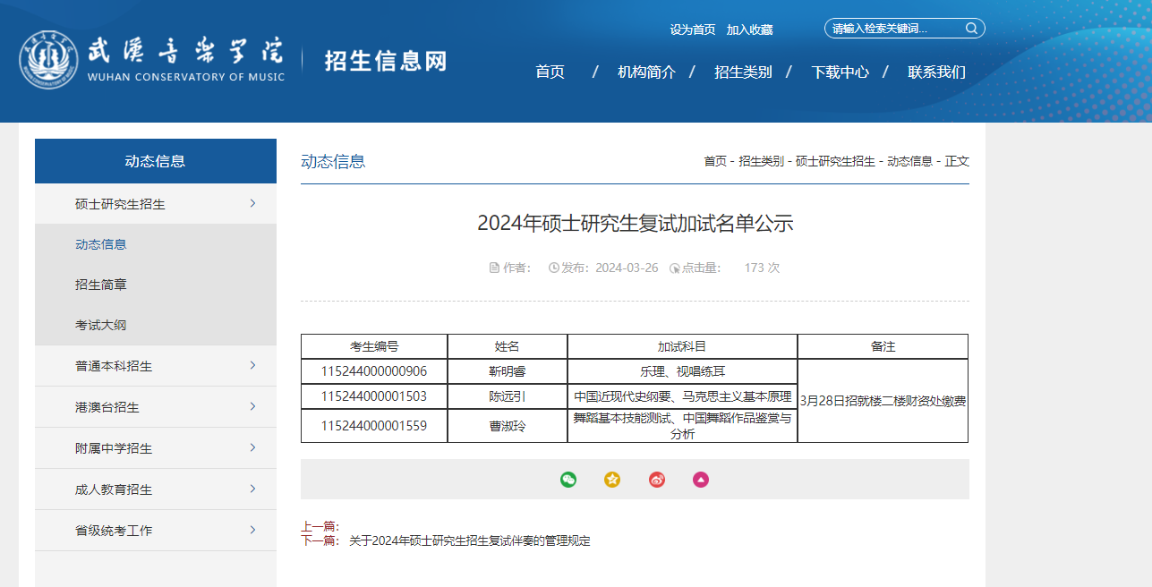 2024年武汉音乐学院硕士研究生复试加试名单公示