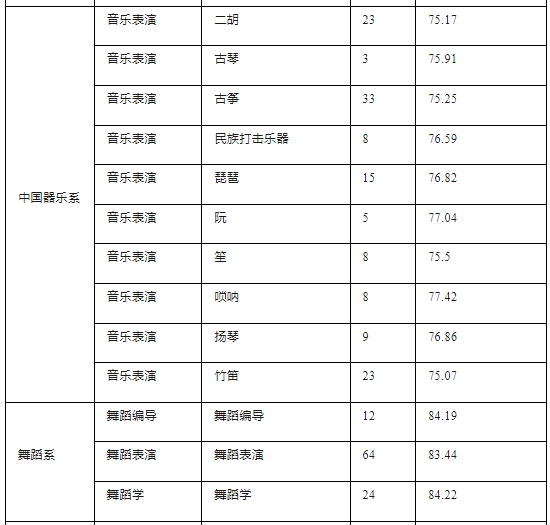 校考成绩最低控制线:舞蹈表演专业、舞蹈编导专业、舞蹈学专业、音乐表演专业(指挥方向除外)校考成绩最低控制线75分,音乐教育专业、音乐治疗专业校考成绩最低控制线70分,音乐学专业、音乐表演专业指挥方向校考成绩最低控制线65分,作曲与作曲技术理论、录音艺术专业校考成绩最低控制线60分。