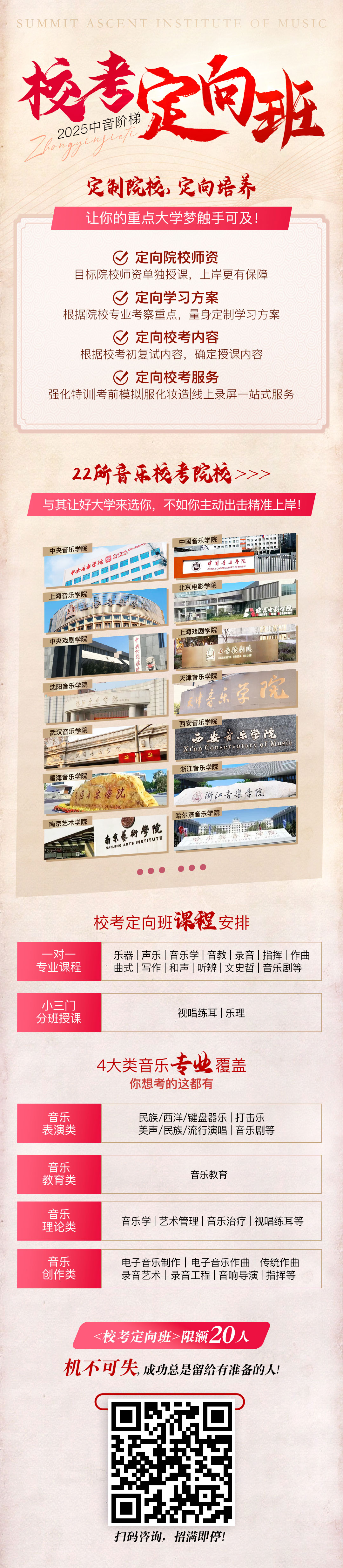 面向全国征召25届音乐艺考专业优秀学子,开设2025届校考定向班,定向院校师资+定向学习方案+定向校考课程+校考全程服务!