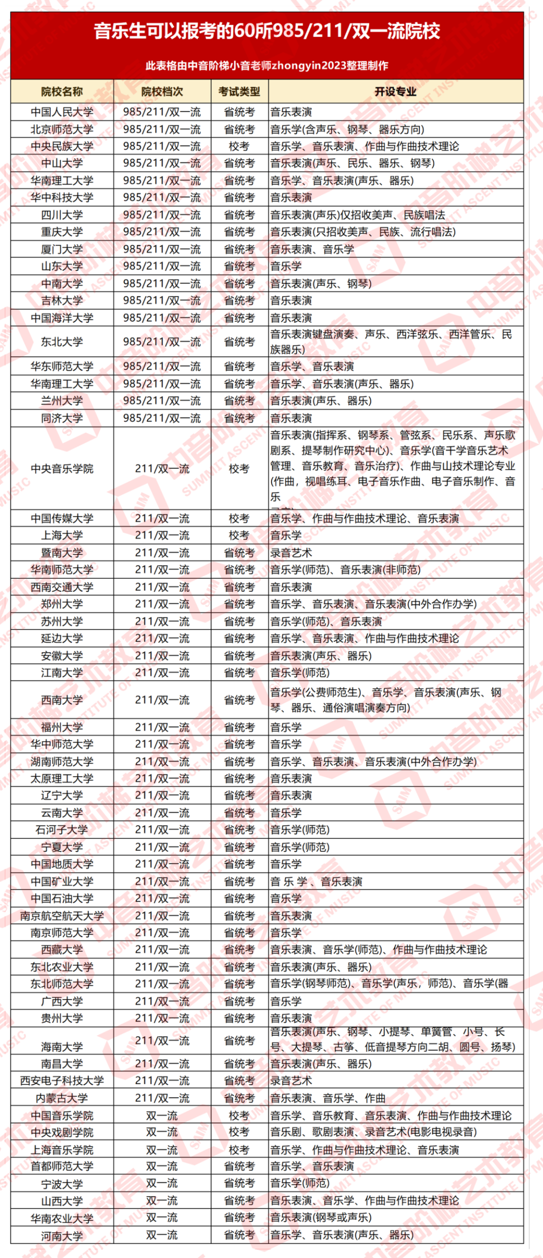 除了11大音乐学院、艺术类院校,音乐生还可以报考这60所985/211/双一流大学,音乐表演、音乐学、作曲与作曲技术理论专业均有招生。