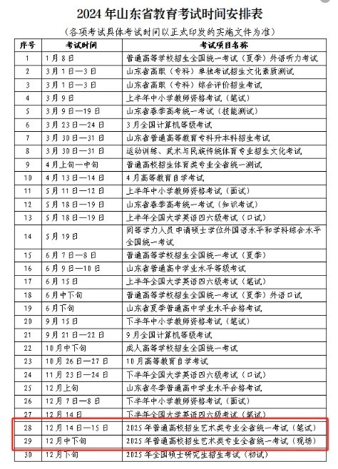 与2024年的考试安排对比可以发现,山东省的考试时间至少提前了3天,根据目前考试时间表推算:山东省音乐生艺术类联考的考试报名时间大概在10月底到11月初。