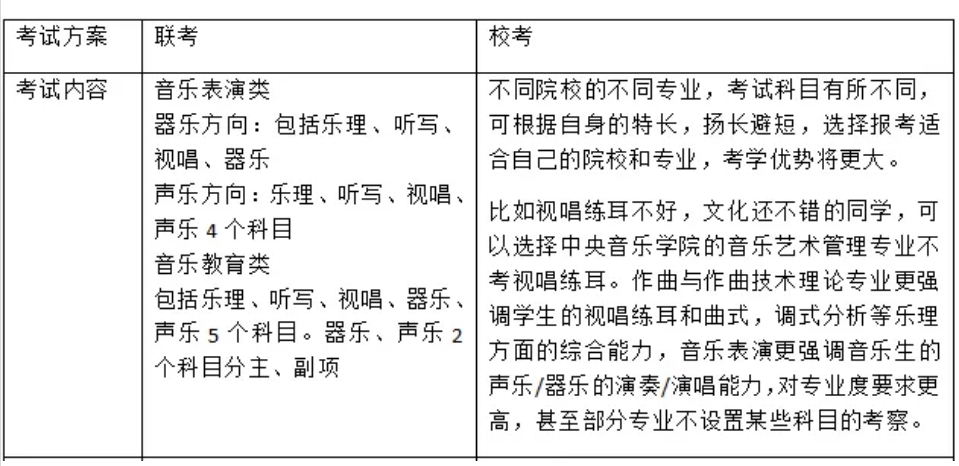 组织校考的院校,其音乐类专业考试科目由院校自己确定,考试内容更加精确,对专业度要求更高。而联考院校的考试内容,对专业的要求比较基础。对于有偏科现象、想选择擅长科目考试的同学一定要参加校考,坚持走主攻攻校考,兼顾统考的备考方案。打破联考考试形式单一特点,主攻校考,多考一次就考一次上大学的机会,取得多个合格证,来提高考学成功率。