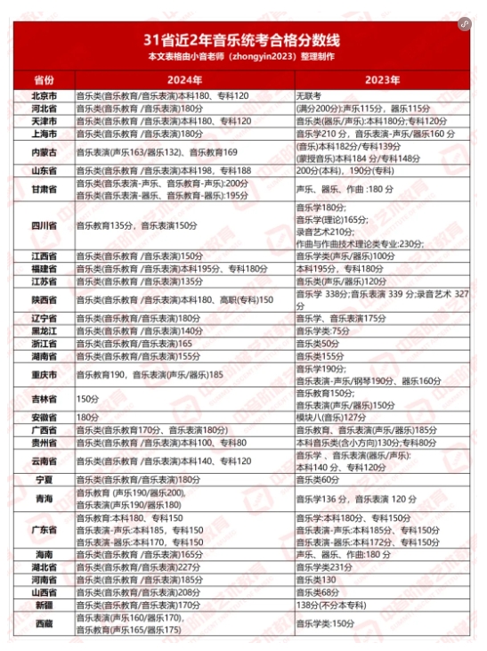 校考上,音乐教育和音乐表演校考录取原则上按专业成绩由高到低录取。校考院校按照文过专排录取生源,音乐生的成绩按照过普本线和过省艺术类分数线,其中过省艺术类分数线是在普本线的学生招生未满的情况下,按照校考专业成绩从高到低依次录取。备注:部分院校的音乐教育专业不在破格录取的名单中,例如:中央音乐学院、中国音乐学院、上海音乐学院、中国传媒大学等,需要音乐生特别注意音乐教育:文化录取分数在400-550分左右音乐表演:文化录取分数在350-460分左右统考的录取原则上多数为按专业和文化形成的综合分录取,不分院校有专业成绩报考限制。其中大部分省份综合分比例为文化50%、专业50%,湖南省的专业占70%+文化30%,湖北省专业占60%+文化40%等比例分配,也是需要音乐生特别注意的。