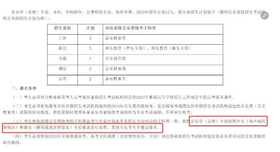 其次,华东师范大学仅面向上海、浙江、安徽、福建、山东四省招生,其他省份并没有设置该专业的招生资格,即使专业成绩再好也报不了该院校,这也是音乐生联考 中经常出现的问题,也是25、26届音乐生选择目标院校需要特别注意的地方。