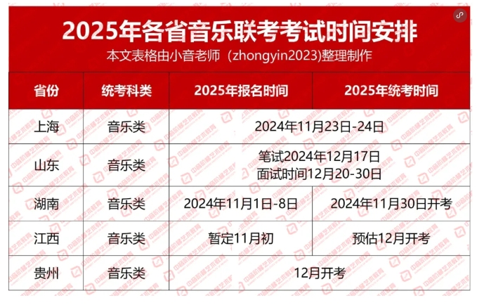 已经确定了在12月份开始音乐艺考联考的省份有江西省和贵州省两省。这个是目前为止,教育考试院公布了2025年音乐艺考联考时间的省份。但是,其实在此之前,上海和湖南两省也是确定了要将音乐联考考试时间提前的。