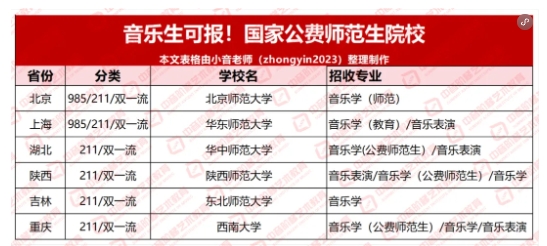选择不同的师范生,音乐生在升学和就业时得到的政策支持是不同的,我们根据师范生的类型、特质分为以下几类:公费师范生:公费师范生包括国家公费师范生和地方定向公费师范生两大类,毕业后能直接拥有教师编制的师范生,也是目前未来倾向考编、进入教师编制的大部分学生的选择。●国家公费师范生:由教育部直属的师范院校如北京师范大学、华东师范大学等培养,毕业后通常回生源所在省份中小学任教,并承诺从事中小学教育工作6年以上。