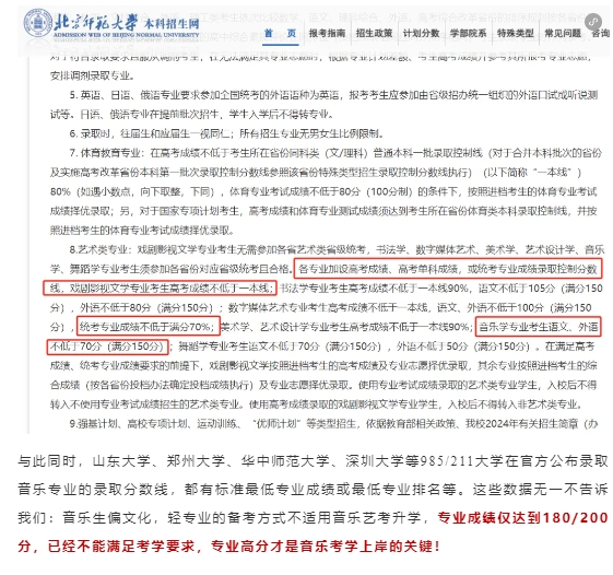 考学门槛升高!25、26届音乐生一定要注意!在北京师范大学的2024年招生章程中明确提出:艺术类专业假设高考成绩、高考单科成绩、或统考专业成绩录取控制分数线。其中在数字媒体艺术专业要求考生统考专业成绩不低于满分70%,而音乐专业在实际招生中,专业的统考成绩也是在70%左右。