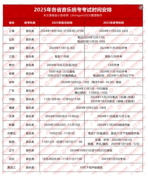 2025年音乐艺考生17个省的统考报名和时间