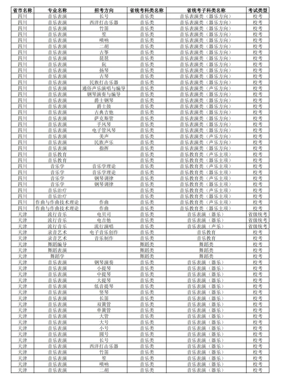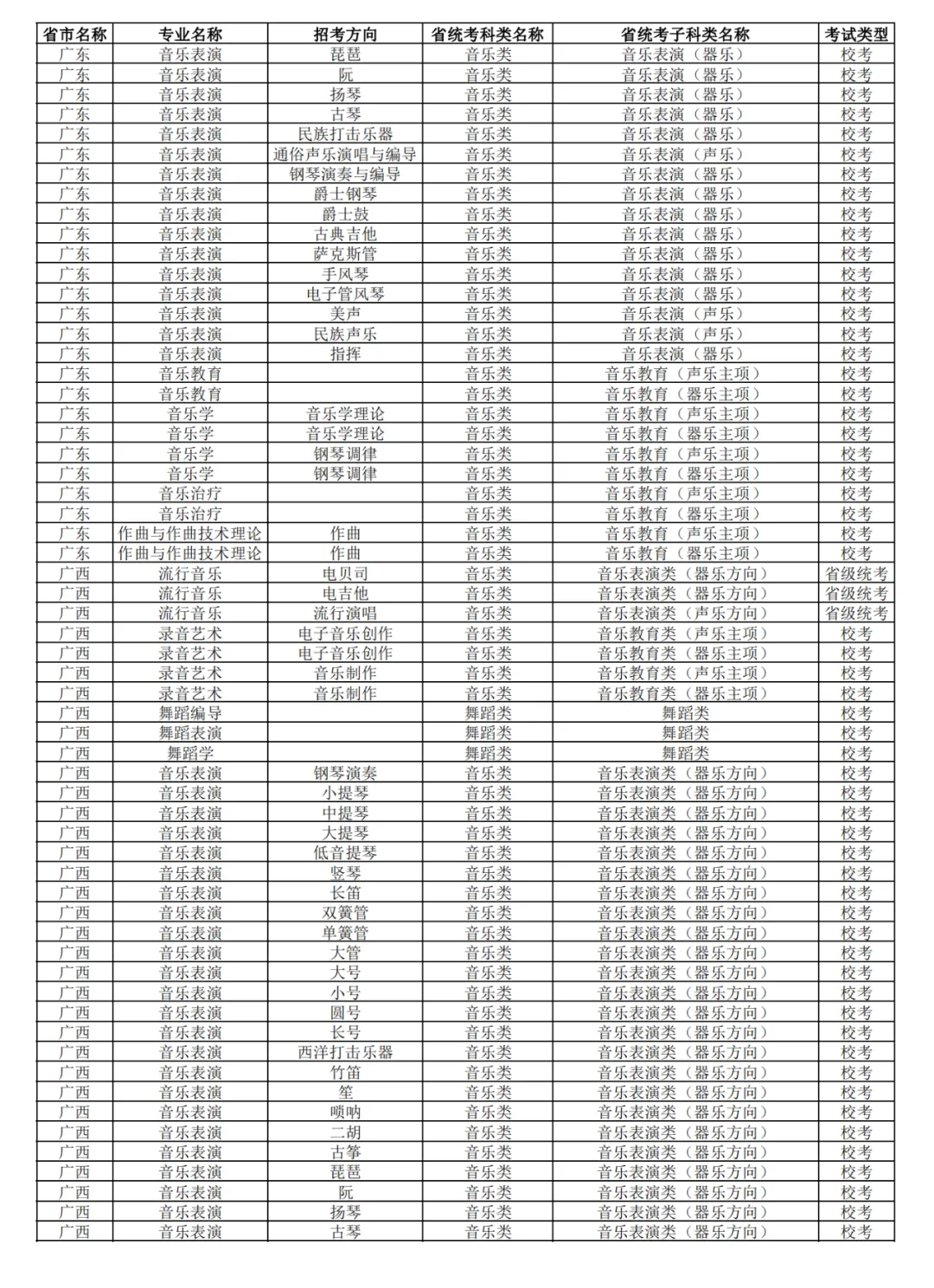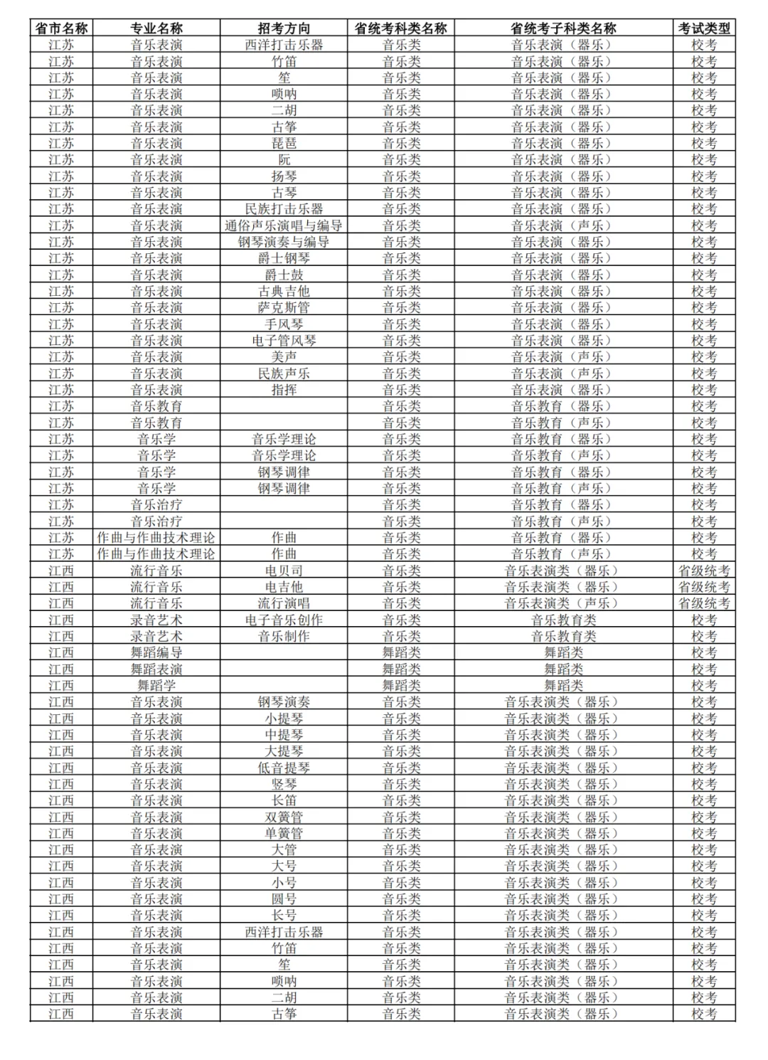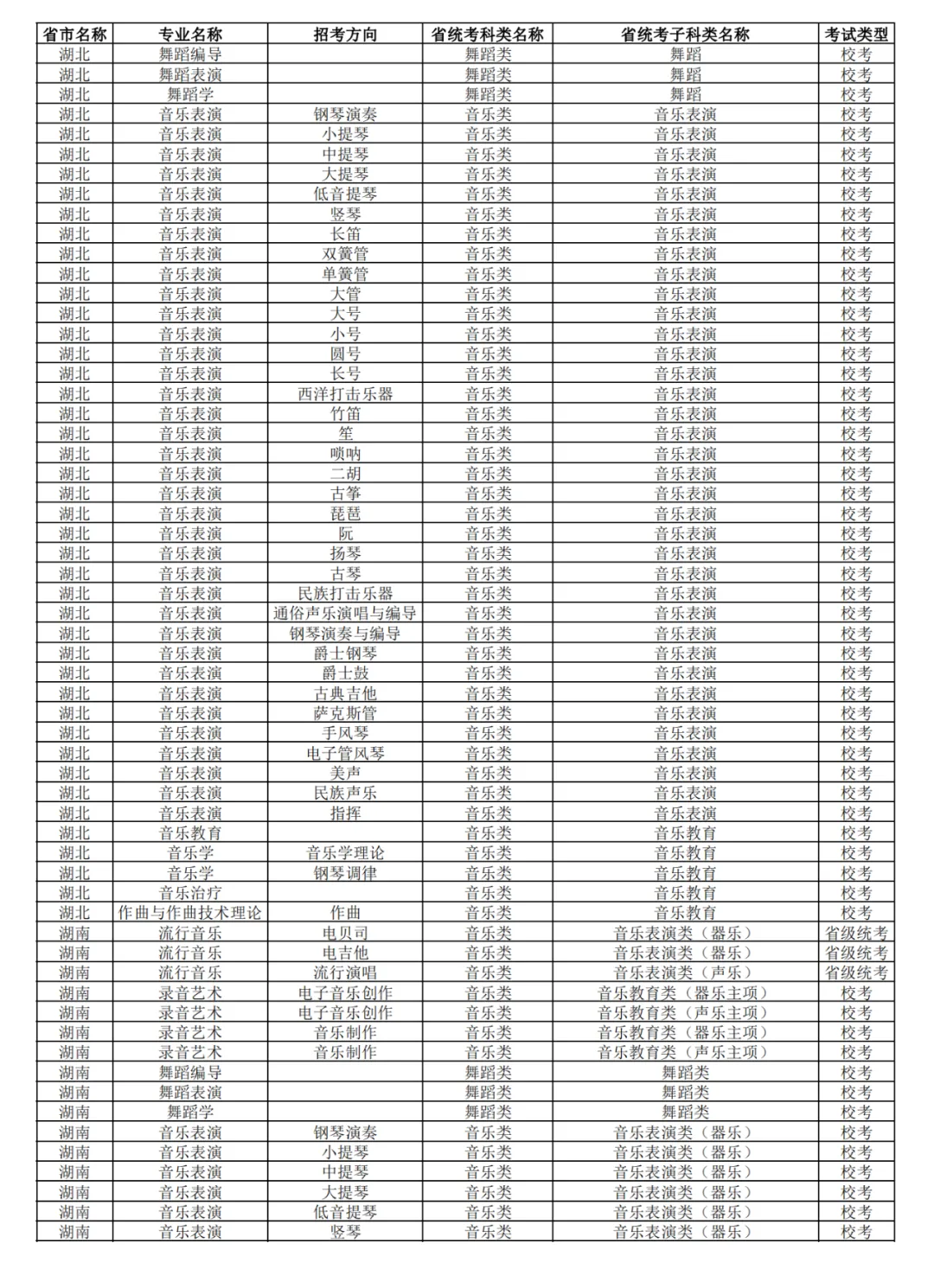 武汉音乐学院2025年本科招生专业和各省统考子科类对照表
