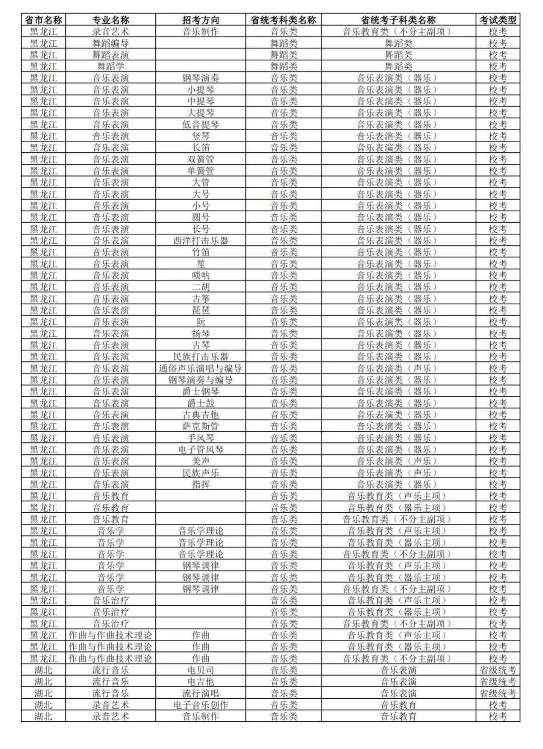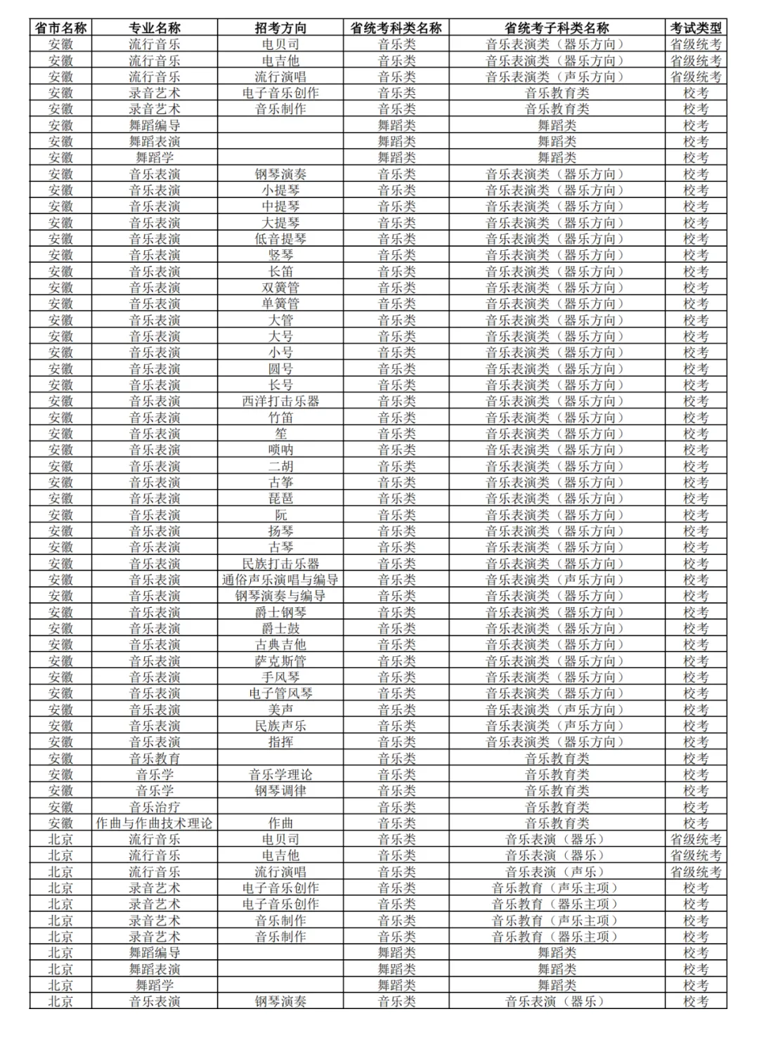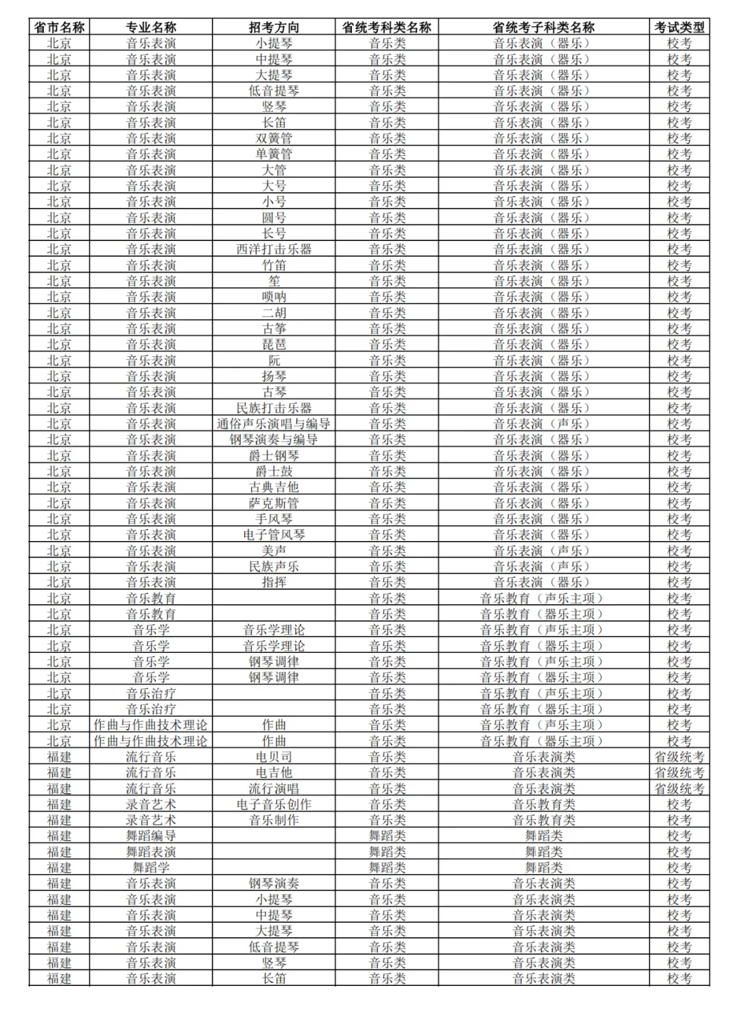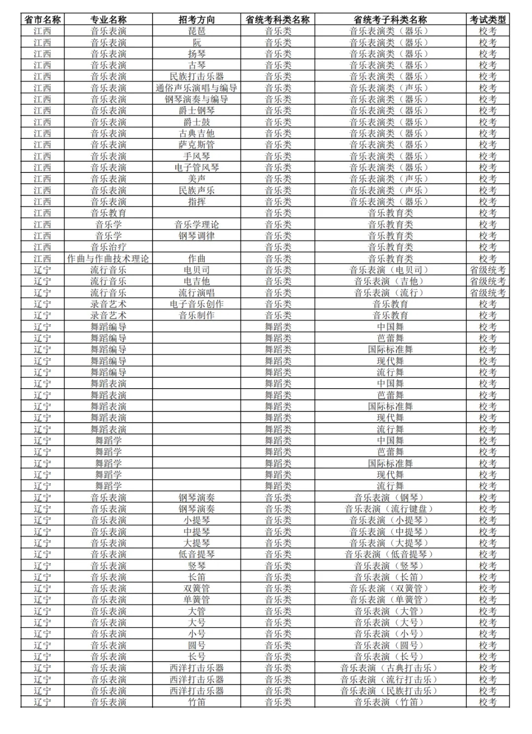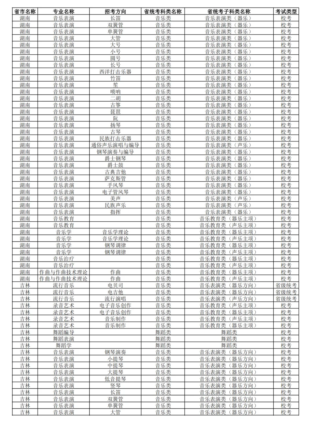 武汉音乐学院2025年本科招生专业和各省统考子科类对照表