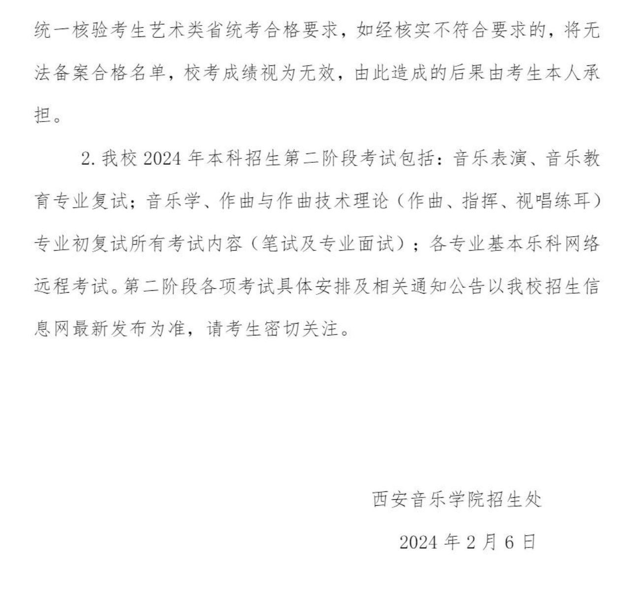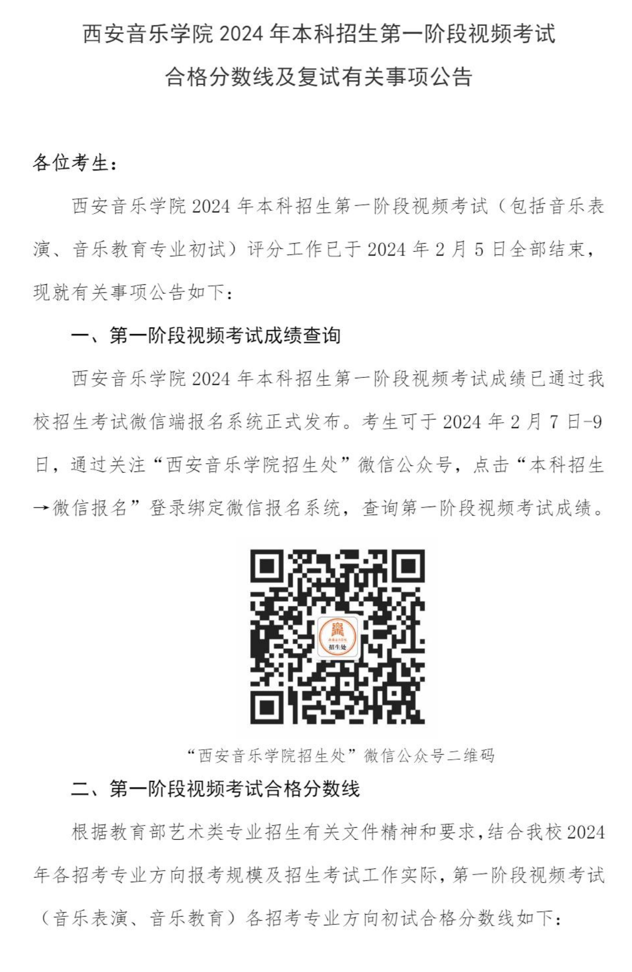 西安音乐学院2024年本科校考第一阶段视频考试合格分数线及复试安排