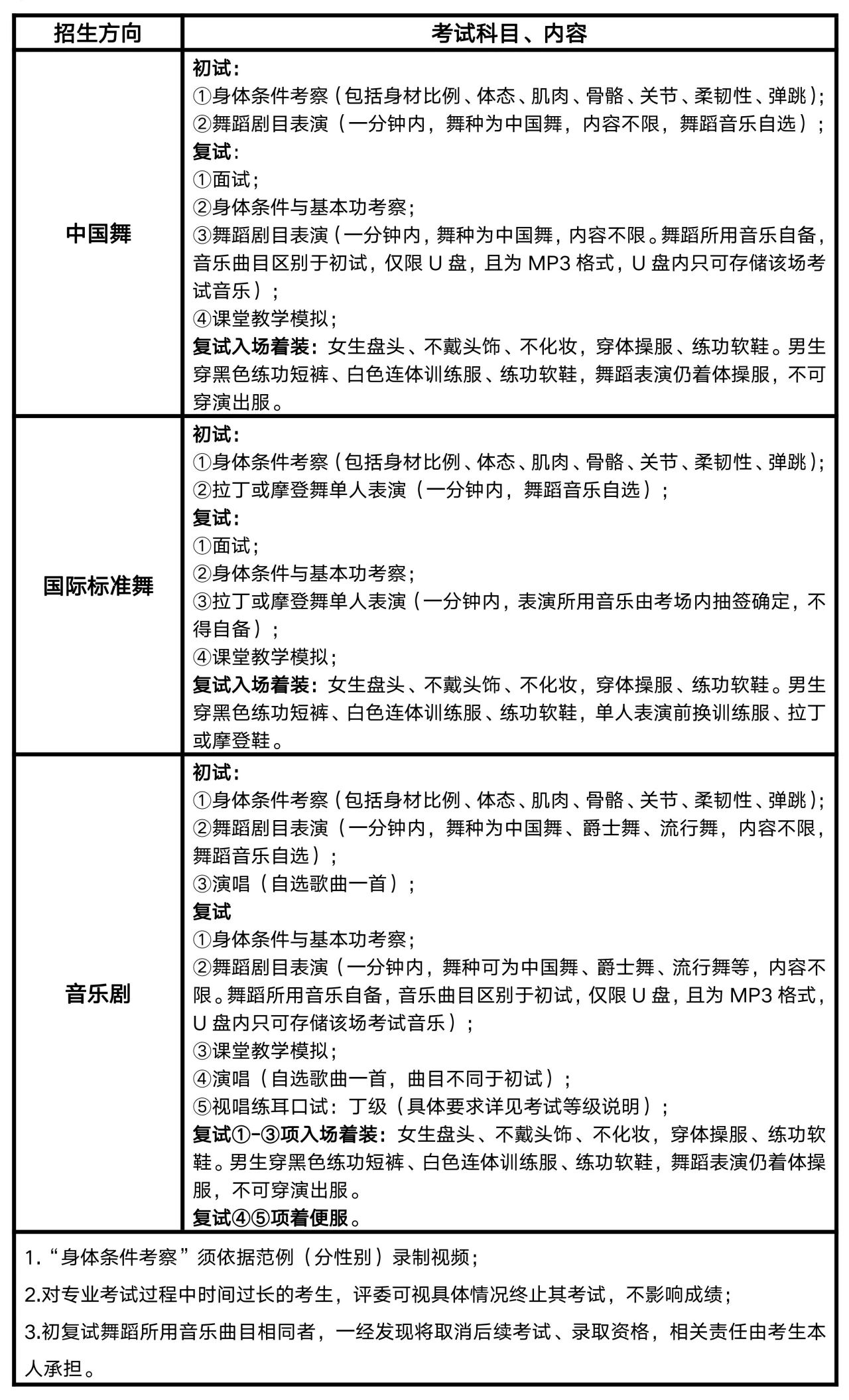 ② 舞蹈表演专业:身心健康,无任何不适宜从事舞蹈训练和集体学习、生活的疾病与缺陷。音乐剧方向考生听觉及发声器官无疾病;