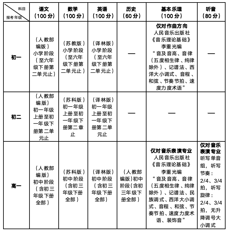 3.高一年级音乐表演专业分别划定文化、专业复试总成绩最低控制分数线,均达最低控制分数线者,按综合成绩(分方向)从高到低择优录取,综合成绩(满分100分)=文化总成绩/3.6*50%+专业复试总成绩*50%,保留到小数点后两位;