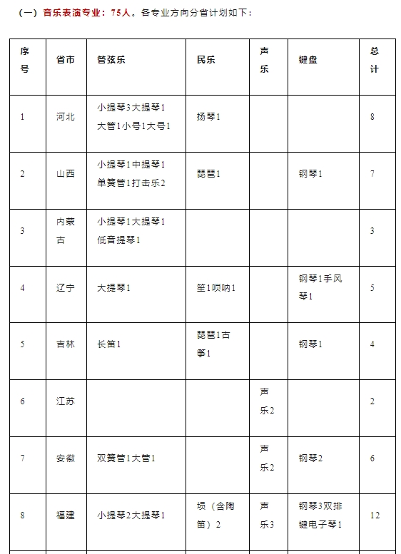 我校艺术类专业不组织校考,报考考生须参加所在省份组织的相应专业省统考,高考文化投档成绩(含全国政策性加分,下同)和专业省统考成绩均达到所在省份划定的相应批次艺术类专业录取控制分数线,方可填报我校相应专业志愿。其中报考音乐表演[民乐方向-埙(含陶笛)]专业的考生,音乐类专业省级统考测试乐器类型必须为民乐;报考音乐表演专业其他器乐方向的考生,音乐类专业省级统考测试乐器类型必须与报考我校乐器项目一致。三、录取规则