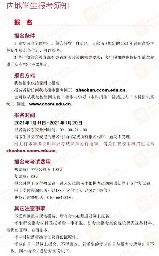 中央音乐学院2021年本科招生简章