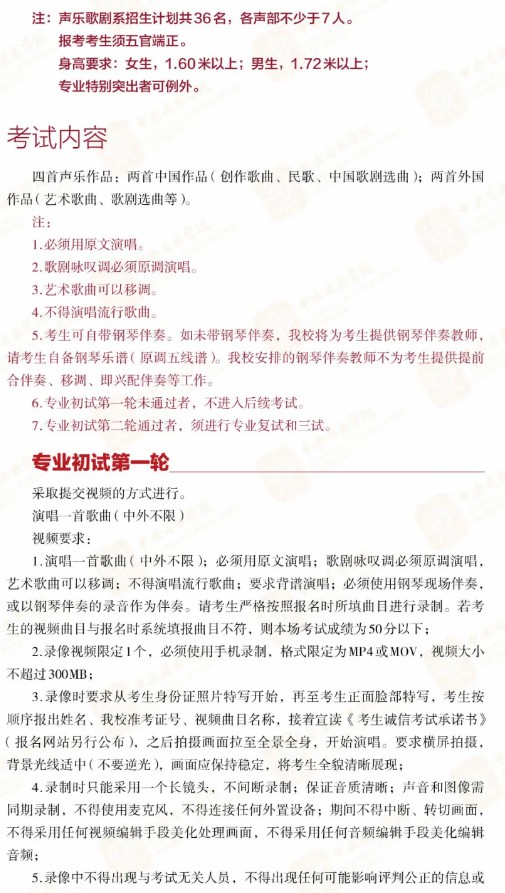 声乐歌剧系:初试一轮以提交视频的方式进行,后续轮次的考试以现场考试方式进行。