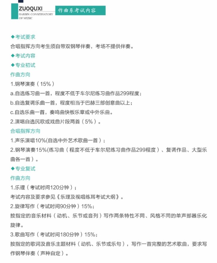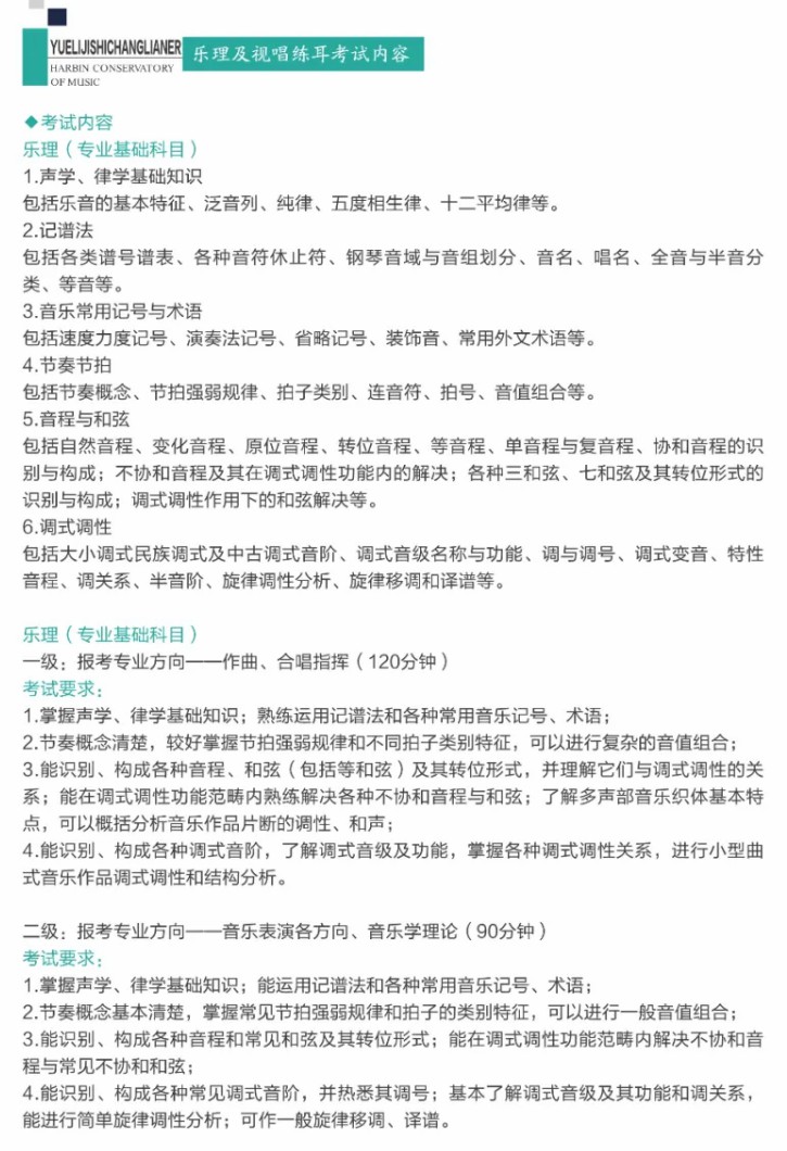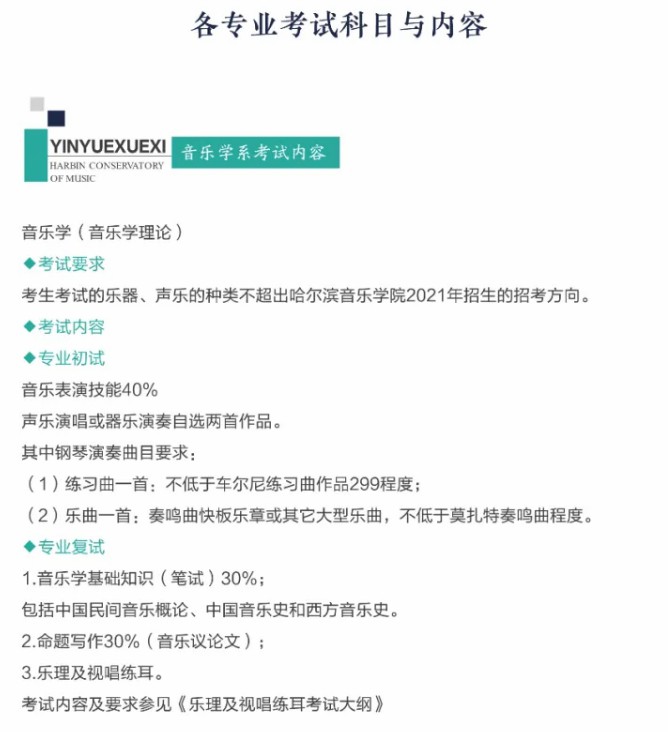 考试内容详见《招生简章》,已经在“哈尔滨音乐学院微信公众号”“哈尔滨音乐学院教务处微信公众号”公布。