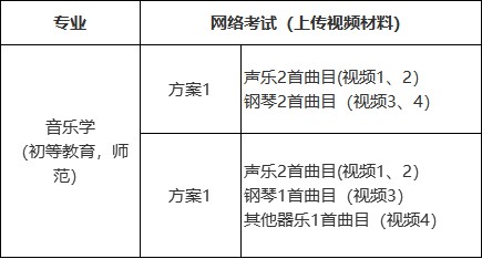 2.报考音乐学(初等教育,师范)专业根据是否考察其他器乐分为两种考试方案,报名时只能选择一种方案参加考试。