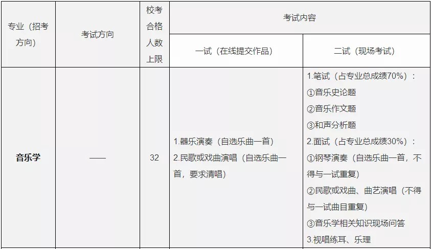 (1)“校考合格人数上限”指该专业(招考方向)校考合格考生人数较高限额,不代表实际合格人数。我校将在公布专业考试合格名单时公布音乐学和音乐表演(器乐演奏)2个专业分省分专业计划。