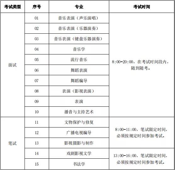 1.音乐表演(乐器演奏招考方向)、音乐表演(声乐演唱招考方向)、音乐表演(键盘乐器演奏招考方向)、流行音乐、表演、影视摄影与制作、舞蹈表演、绘画、中国画、雕塑、书法学、文物保护与修复专业、戏剧影视美术设计专业按专业成绩录取。若专业成绩相同,则按文化成绩择优录取。若文化成绩相同,则艺术文或历史学科按语文成绩择优录取,艺术理或物理学科按数学成绩择优录取。