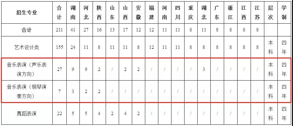 音乐舞蹈类(含音乐表演专业和舞蹈表演专业)招生计划总数为56名。专业成绩采用各省统考或校级联考成绩,按照专业招生、专业培养,学生进校后不能转换专业。