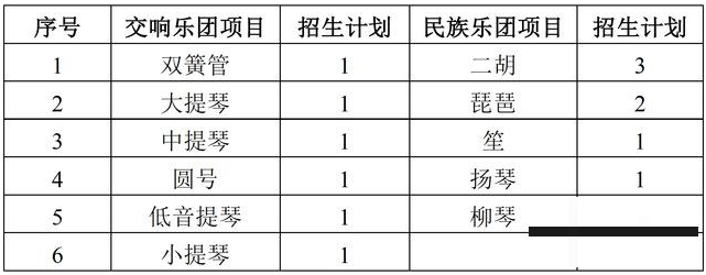 1.专业测试:采用现场录音录像、异地评审方式进行,内容为①自选曲目一首(5分钟内),②视奏(交响乐团项目为五线谱、民族乐团项目为简谱);