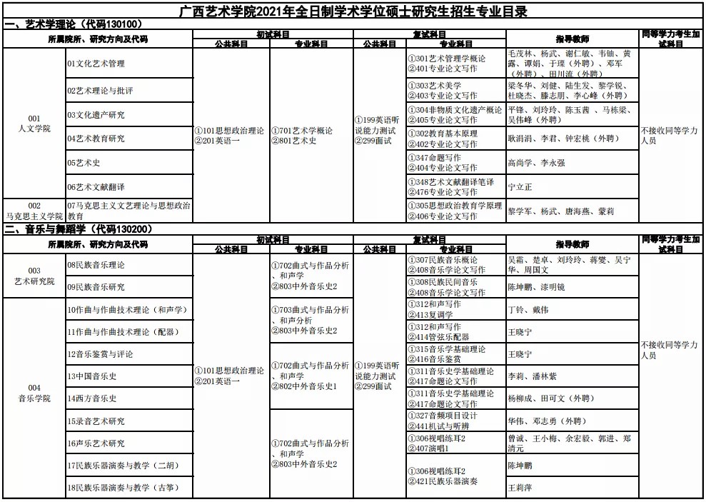(四)各研究方向是否接收同等学力身份考生以及加试内容详见《广西艺术学院2021年硕士研究生招生专业目录》。