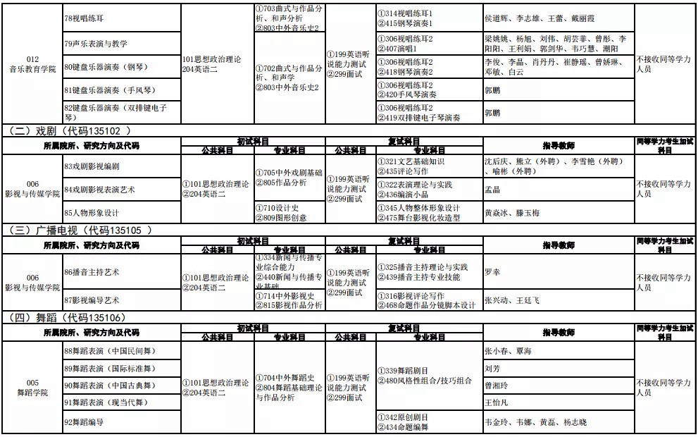 4.器乐类考生报考注意事项:民族乐器演奏研究方向仅限报考扬琴、古筝、二胡、唢呐四种乐器。管弦乐器演奏研究方向仅限报考小提琴、大提琴、单簧管、长号、长笛五种乐器。